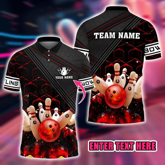 Bowling Polo Shirt, Custom Name & Team Name, 3D Print Bowling Ball and Pins Design, Sports Jersey for Bowlers, Sports Casual Top.