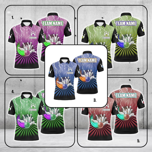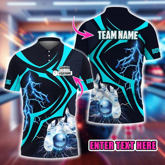 Custom Bowling Polo Shirt, Personalized Name and Team Jersey, Lightning 3D Bowling Ball and Pins Strike Design, Gift for Bowlers Men Women.