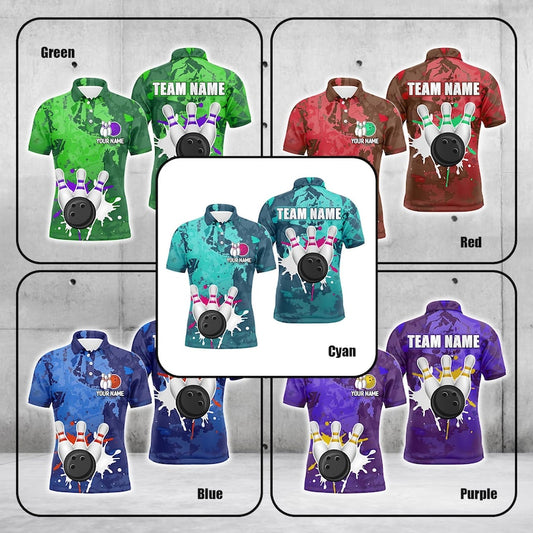 Custom Bowling Polo Shirt, Personalized Name 3D Color Splash Bowling Ball and Pins Design, Bowling Team Jersey Gift for Bowlers Men Women.