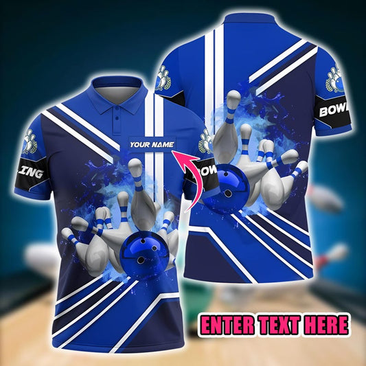 Custom Bowling Polo Shirt, Personalized Name and Team Jersey, Blue 3D Bowling Ball and Pins Strike Design, Sportswear Gift for Bowlers.