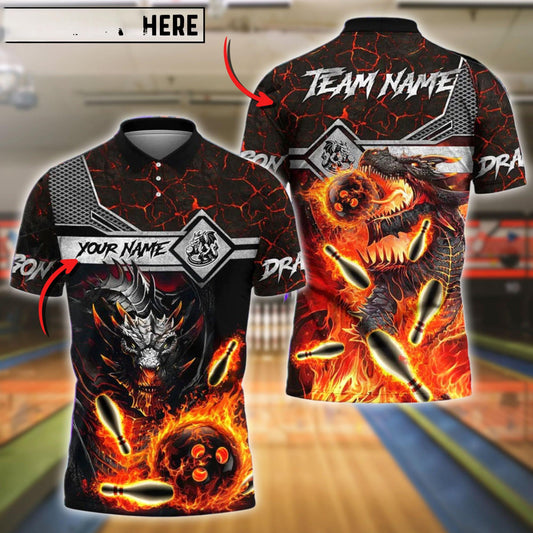 Bowling Ball & Pins Fire Dragon Customized Name, Team Name 3D Shirt (4 Colors)