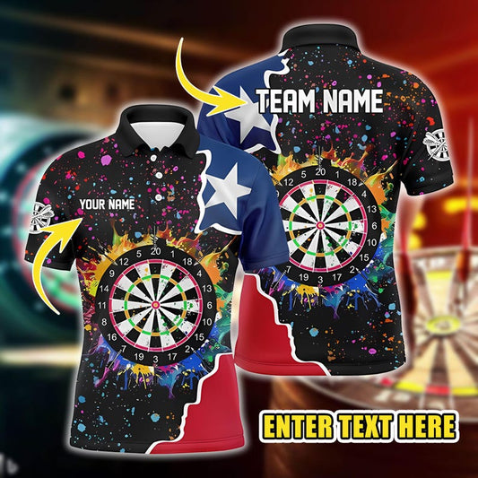 Custom Darts Polo Shirt with Colorful Paint Splash Dartboard Design, Personalized Team Name & Player Name Jersey, Unique Gift.