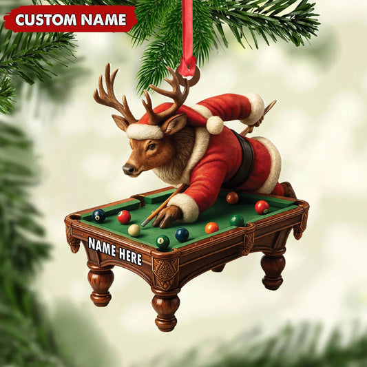 Personalized Acrylic Deer Christmas Ornament - Funny Buck Playing Pool in Santa Outfit Holiday Decor
