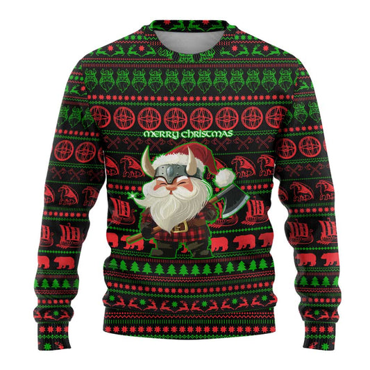 Viking Christmas Ugly Christmas Sweater with Santa Warrior Axe Nordic Symbols Red Green Black Knit Pattern Design