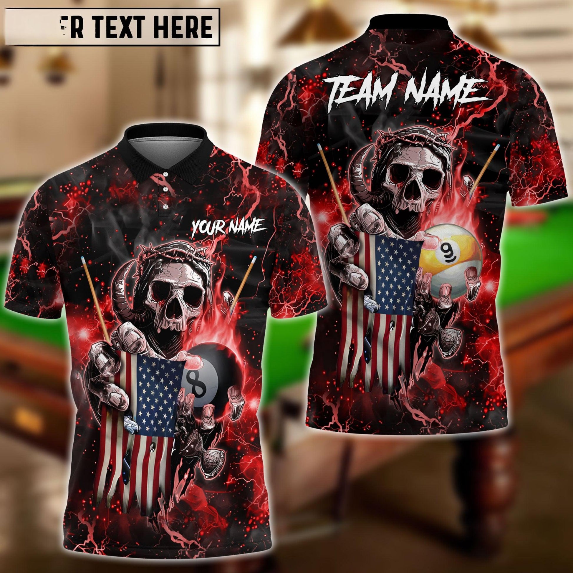 Billiards Ball 8 & 9 Fire Skull US Flag Personalized Name, Team Name Shirt