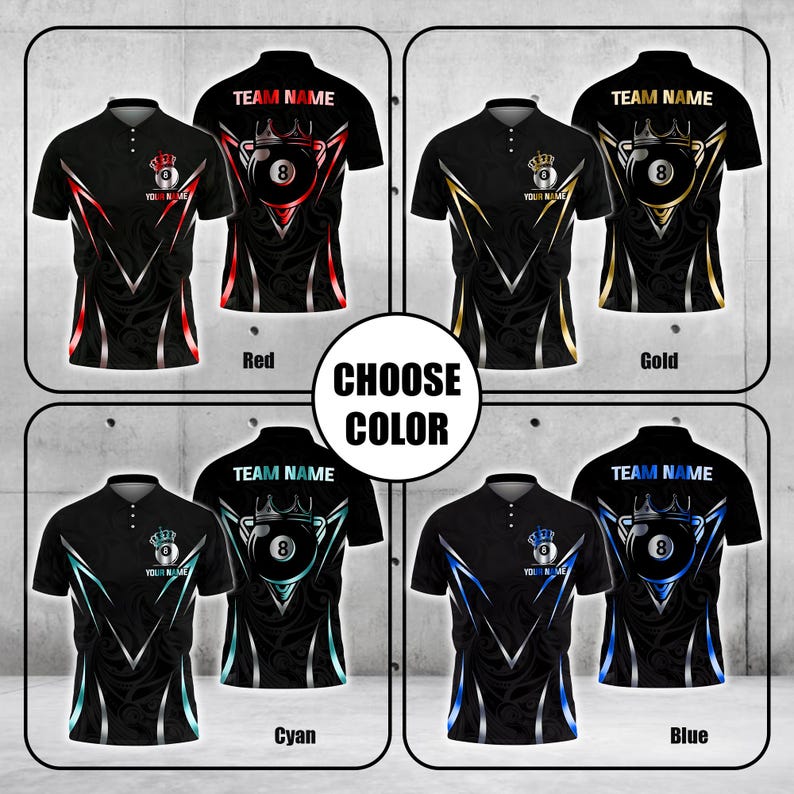 Custom 8 Ball Billiards Polo Shirt, 3D Crown Design with Personalized Name & Team, Multicolor Pool Jersey, Gift for Players and Bowlers.