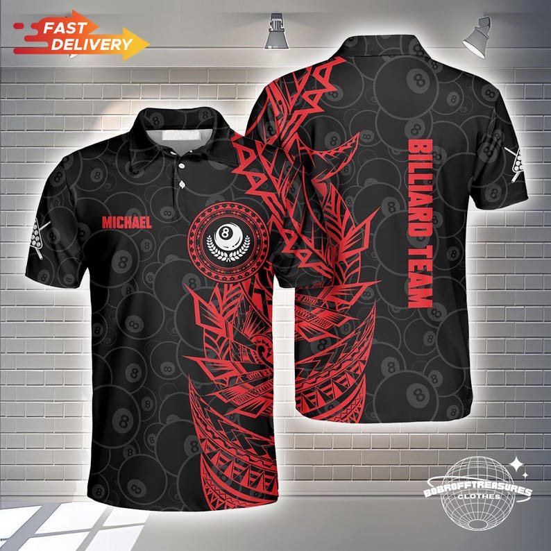 Custom Billiard Polo Shirt Men, 3D Red Black Tribal Print, Team Uniform Pool Shirt, Billiard Gift for Him