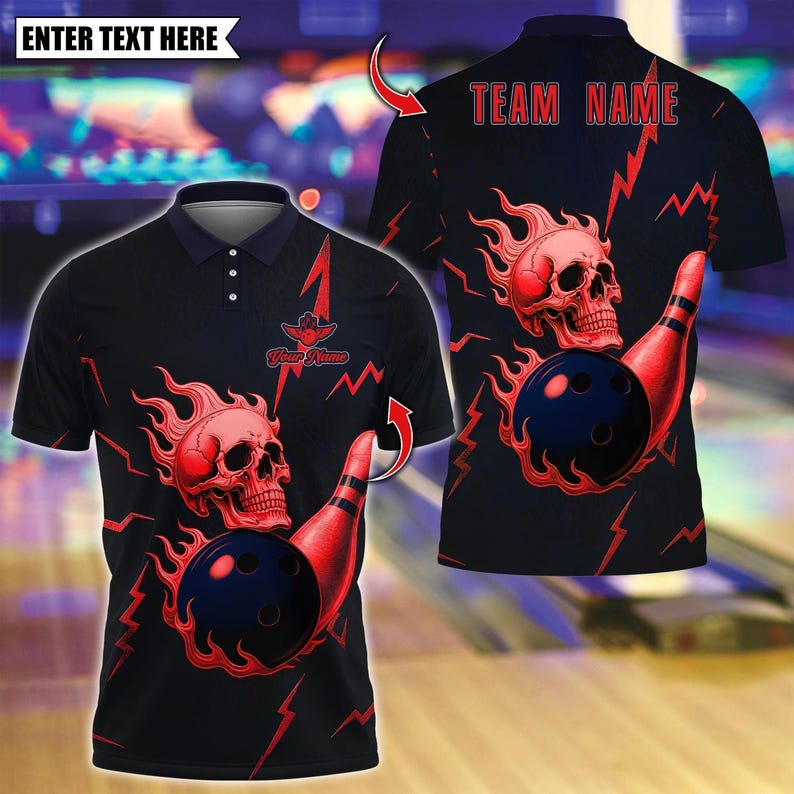 Custom Bowling Polo Shirt, Metal Skull Bowling Design, Personalized Bowling Polo for Men Women, Personalized Name Team 3D Shirt