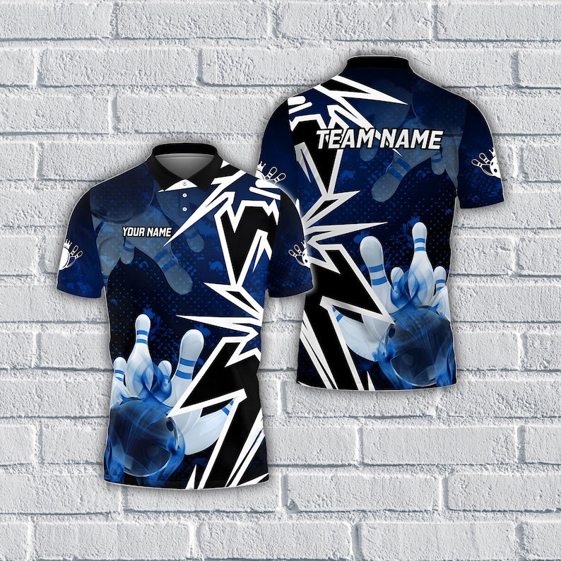 Custom Bowling Polo Shirt, Personalized Name & Team Zipper Jersey, Bowling Ball and Pins Smoke Design Multicolor Polo.