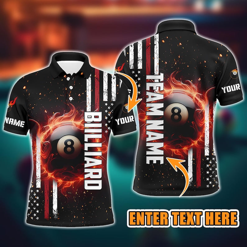 Custom Flaming 8 Ball Polo, Patriotic Billiard Shirt with Personalized Name & Team, Men’s Pool Shirt, USA Flag Design.