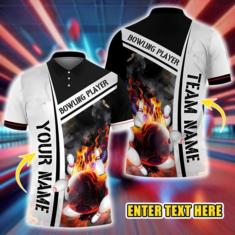 Custom Name 3D Printed Men's Polo Shirt, Bowling Fire Ball Pins Pattern, Summer Streetwear Casual Bowling Jersey Outfit For Unisex Players.