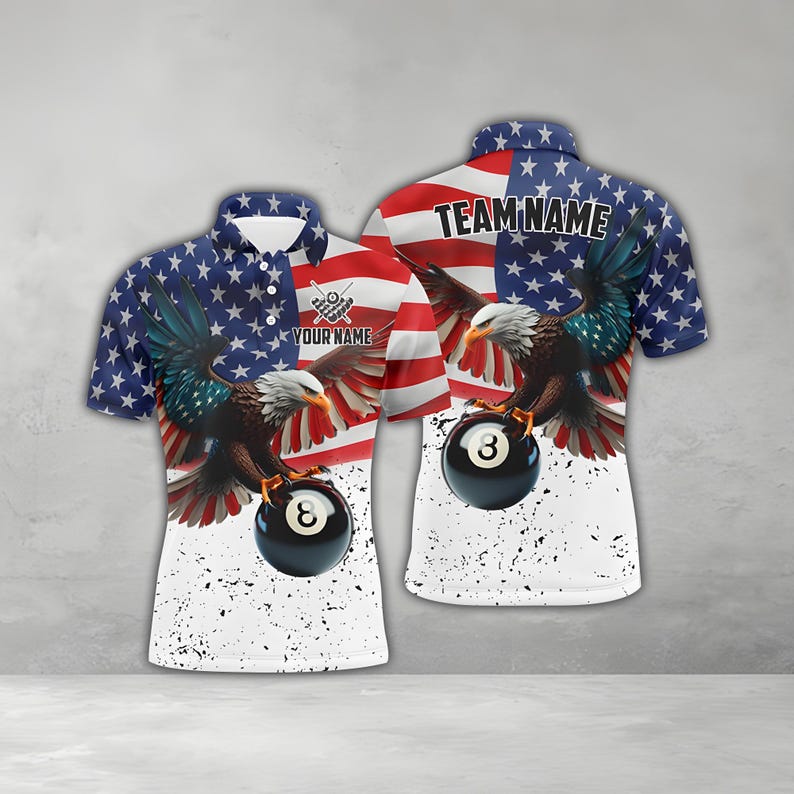 Personalized Men’s Billiards Polo, 8 Ball Eagle Bowling Style Shirt with USA Flag, Patriotic Sports Team Polo, Gift for Friends.