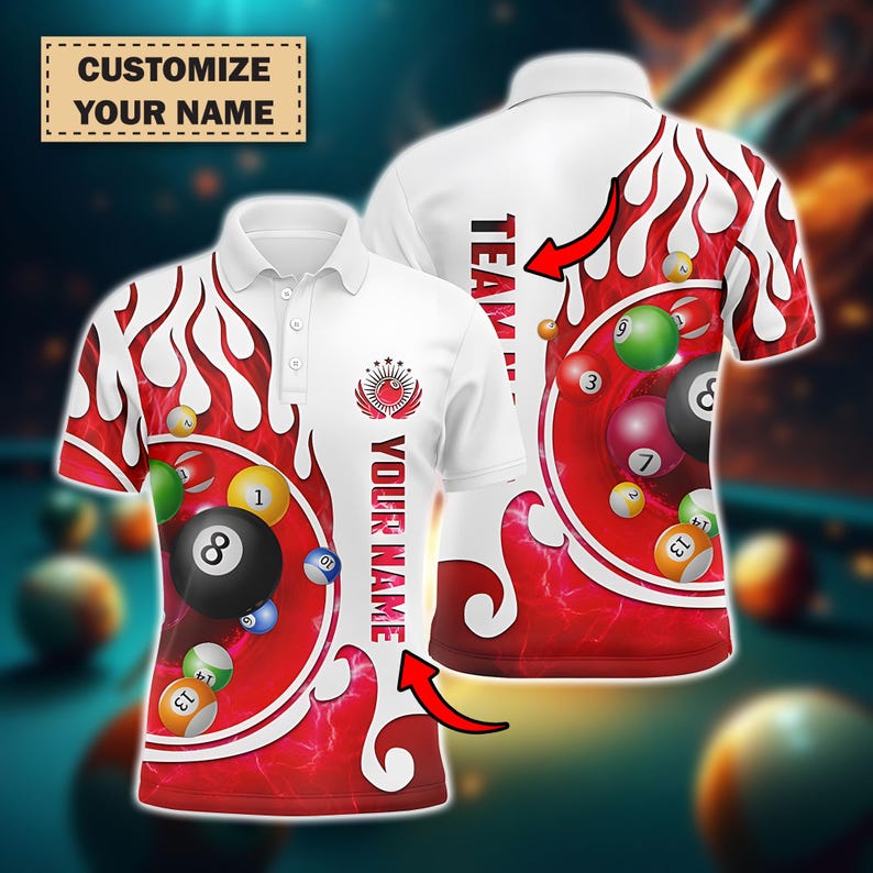 Personalized Name Billiard Fire Polo Shirt For Men, Custom Team Name Pool Shirt, Unique Billiard Jersey Gift For Players.